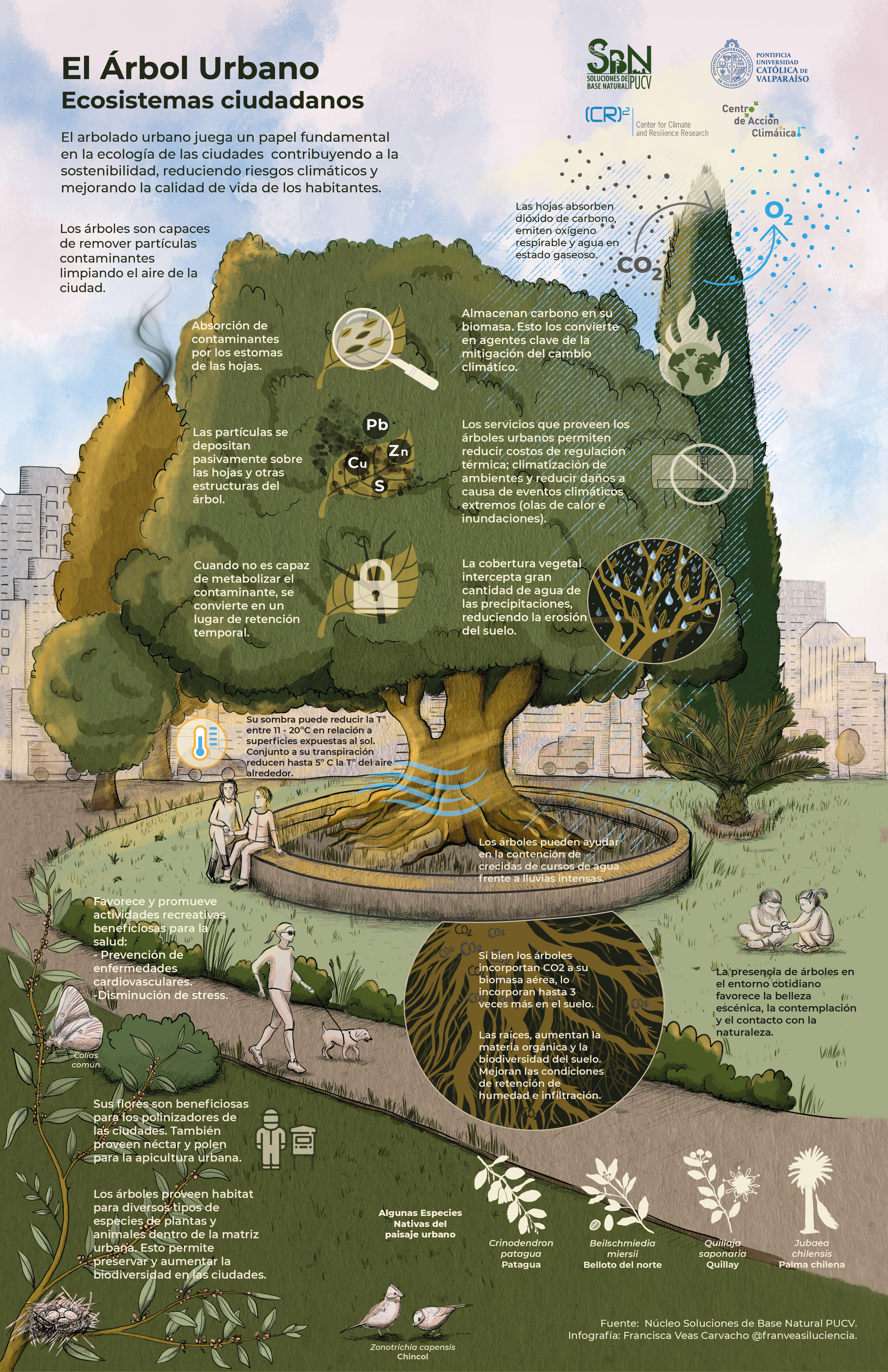 Ariel Muñoz, profesor del Instituto de Geografía PUCV, experto en Geografía Ambiental y Cambio Climático, e investigador del Núcleo, detalla cómo los árboles urbanos buscan mejorar las condiciones de su entorno, en pos de su permanencia: “Por ejemplo, los árboles estabilizan los suelos donde habitan, lo cual nos ayuda, al igual que a ellos, a reducir deslizamientos de tierra, contener inundaciones, regular la temperatura en días calurosos y en olas de calor, además de proveer refugio para otros organismos, como son insectos y aves, lo cual además de generar belleza escénica, provee cercanía con entornos y elementos naturales, aspectos clave en las ciudades resilientes. Por lo tanto, los árboles urbanos, como parte de diseños urbanos sostenibles, son posiblemente la mejor inversión social que podemos hacer en nuestras ciudades para enfrentar el cambio climático”.