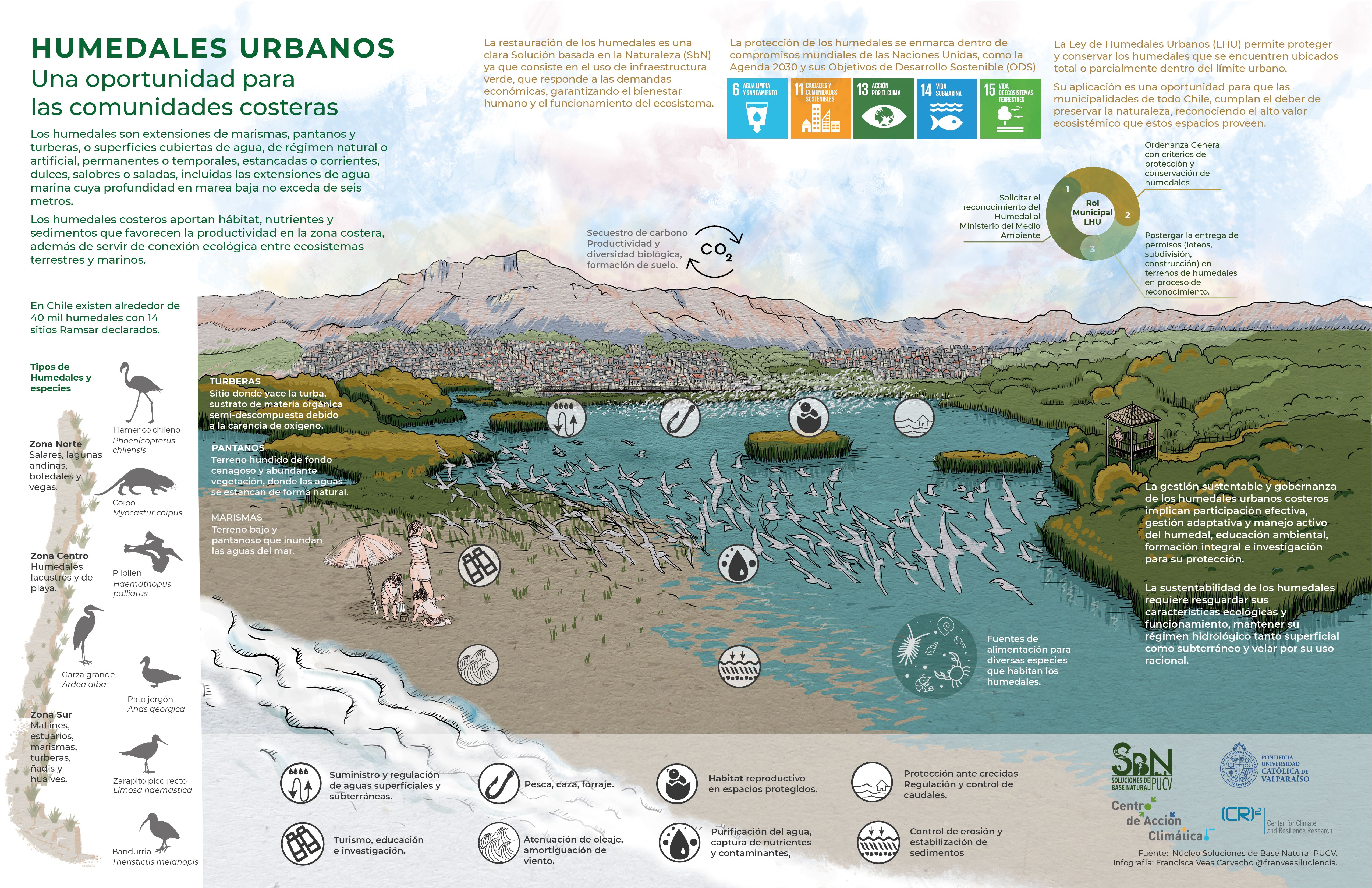 Una serie de infografías, respecto de elementos naturales de los territorios, son las que está presentando el Núcleo de Investigación en Soluciones de Base Natural (N2S) para Desafíos Ambientales Emergentes de la PUCV, con la publicación de dos trabajos: “El árbol urbano” y “Humedales urbanos”. Este trabajo, a cargo de las ilustraciones de Francisca Veas, se enmarca en los Objetivos de Desarrollo Sostenible de Naciones Unidas, basado en la protección de la naturaleza y nuevas estrategias de desarrollo.