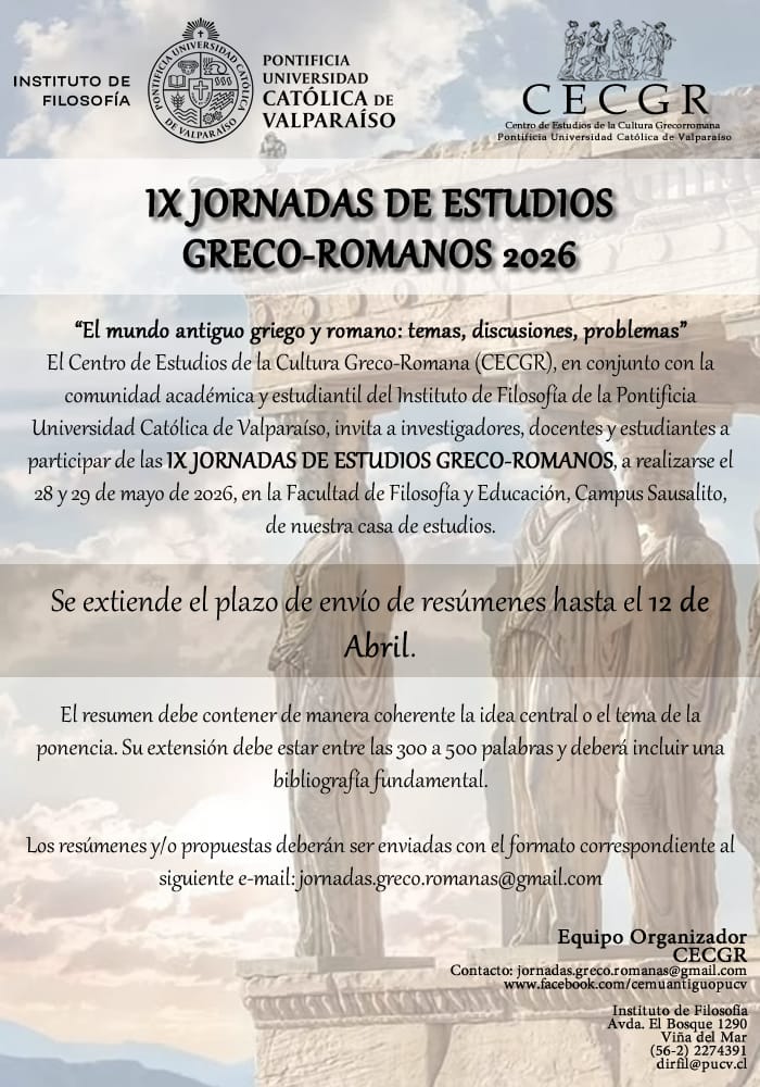 El Centro de Estudios de la Cultura Greco-Romana (CECGR), en conjunto con la comunidad académica y estudiantil del Instituto de Filosofía de la Pontificia Universidad Católica de Valparaíso, invita a investigadores, docentes y estudiantes a participar de la IX JORNADA DE ESTUDIOS GRECO-ROMANOS, a realizarse el 28 y 29 de mayo de 2026, en la Facultad de Filosofía y Educación, Campus Sausalito, de nuestra casa de estudios.