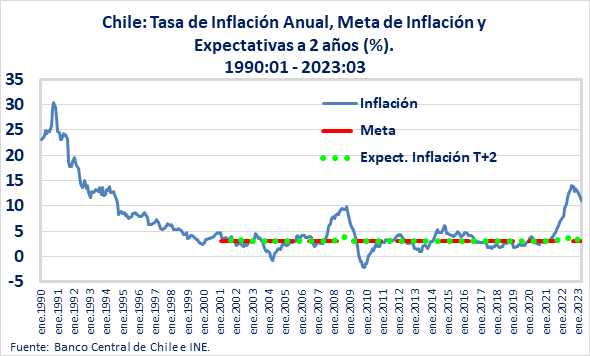 Finalmente, las expectativas de inflación a 2 años plazos de los agentes de mercado, según las encuestas de expectativas del Banco Central, se mantuvieron por sobre la meta de inflación por un año y medio, retornando al 3% anual recién en marzo de este año. Sumado a lo anterior, está el alto grado de indexación de nuestra economía. Por ejemplo, en marzo pasado, la variación de precios de servicios, sin considerar los que son altamente volátiles, experimentó un aumento mensual de 2,7% respecto a febrero, siendo la principal explicación del aumento de 1,1% que tuvo el IPC en marzo de 2023. Aquí entra la indexación de precios como los servicios educacionales, que tienen indexarse a la inflación del año anterior y se aplica a partir de marzo.